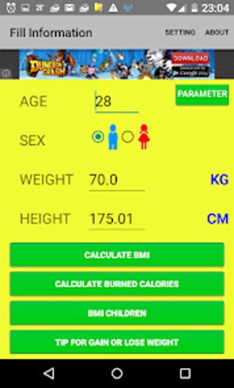 The application features several useful tools, such as calculating your BMI index, ideal weight, and your range of weight. It also calculates the number of calories you need every day and the burned calories when you exercise (Run or Walk). Additionally, the app provides standard weight for children (male and female) and some most important tips for losing or gaining weight. It is important to note that although your BMI does not actually "measure" your percentage of body fat, it is a useful tool to estimate a healthy body weight based on your height.